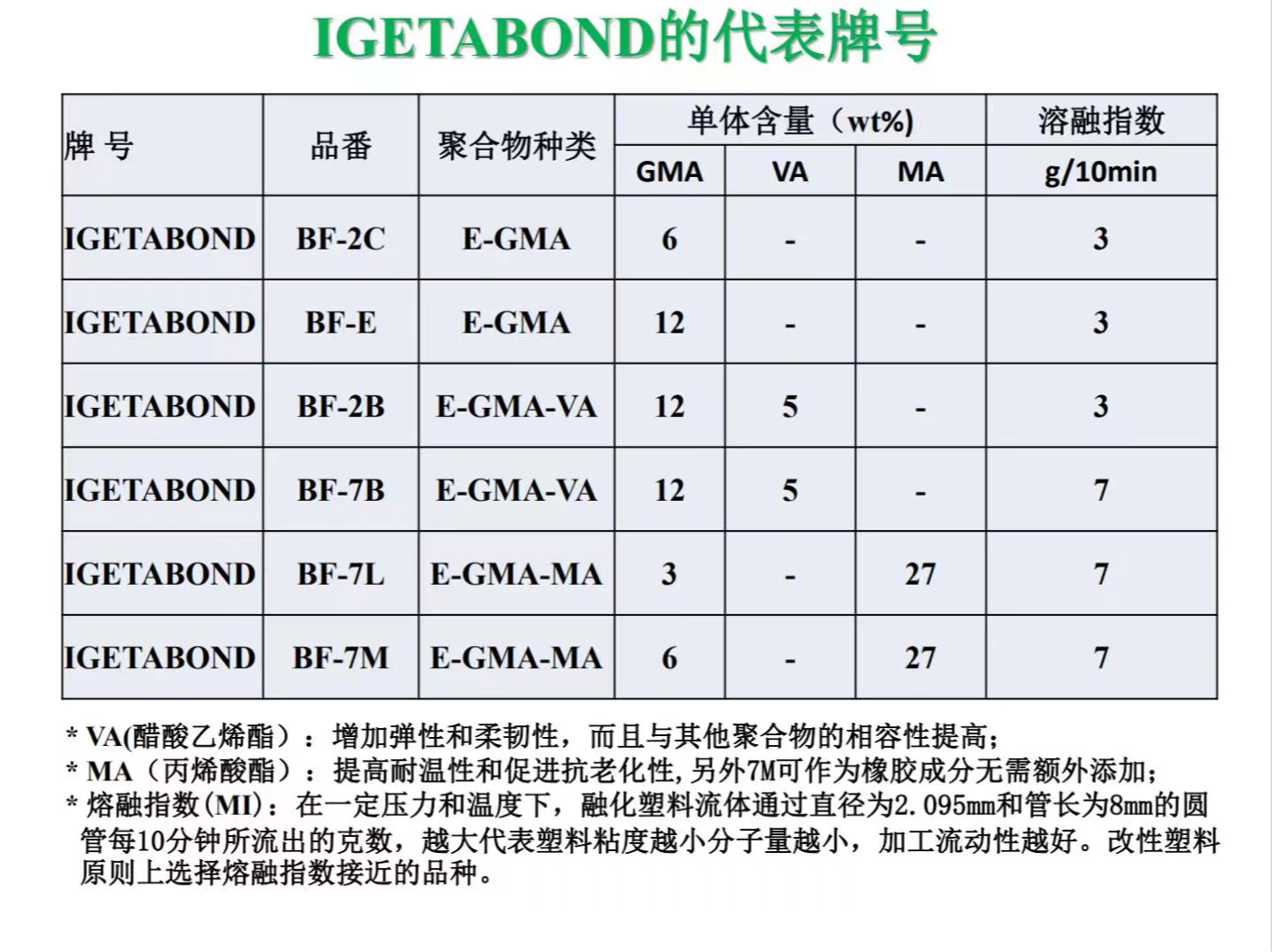 比如最有代表性的牌号BF-7M,可以直接用来添加3-5%来改善GF-PBT复合材料的抗冲击性能。也可以直接用来代替目前市场上广泛应用的国外进口改性剂。
